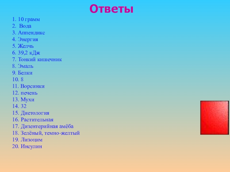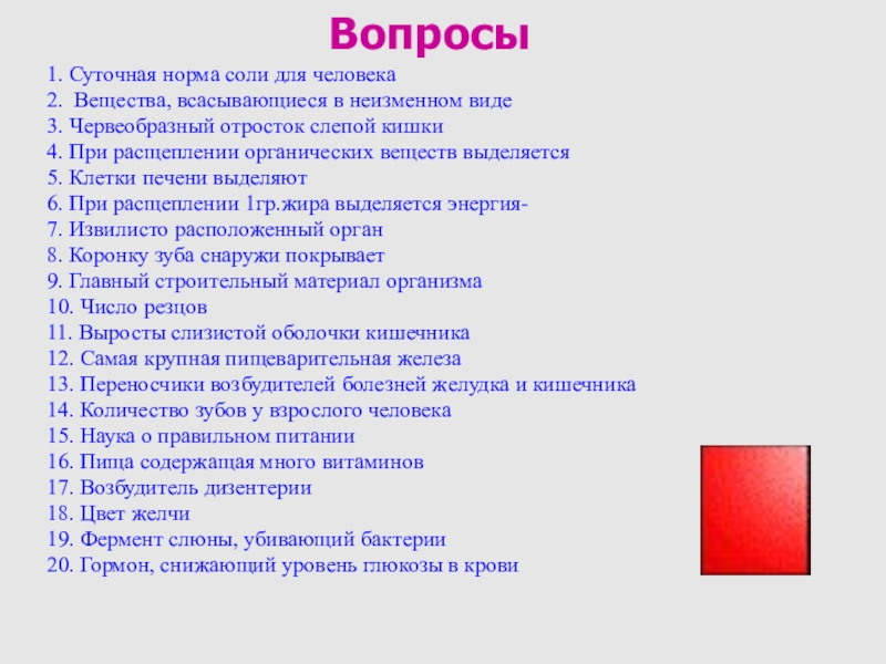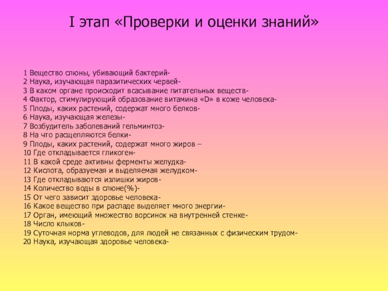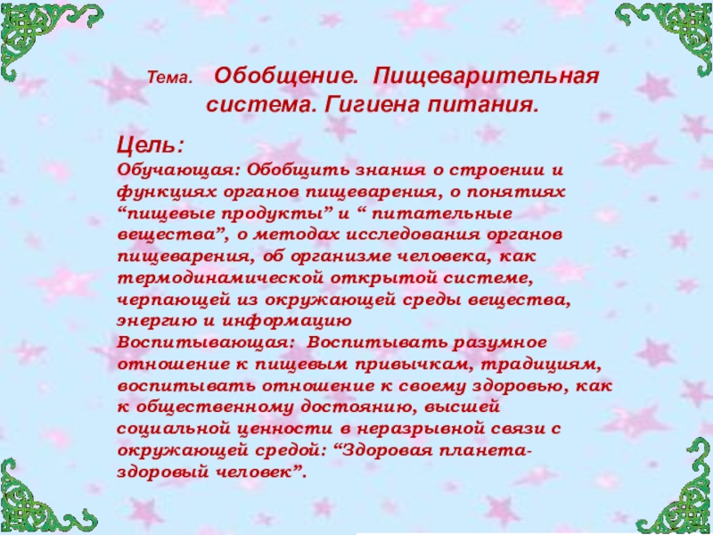 Обучающая: Обобщить знания о строении и функциях органов пищеварения, о понятиях “пищевые продукты” и “ питательные вещества”, о методах исследования органов пищеварения, об организме человека, как термодинамической открытой системе, черпающей из окружающей среды вещества, энергию и информацию