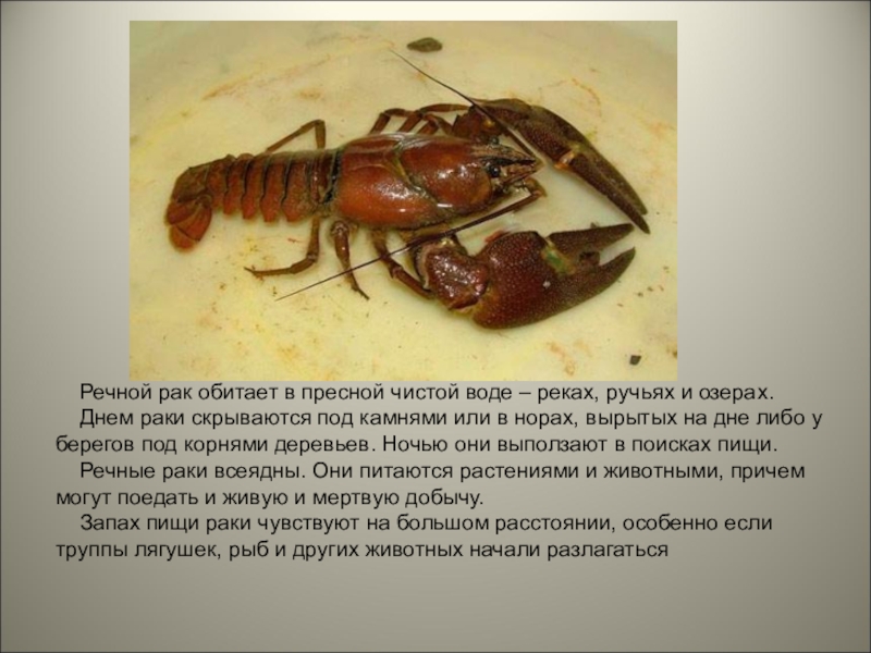 Презентация, доклад по биологии на тему Образ жизни речного рака (7 клаас)