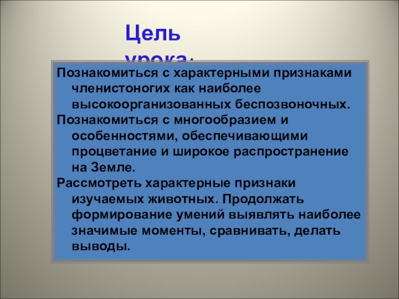 Цель урока:Познакомиться с характерными признаками членистоногих как наиболее высокоорганизованных беспозвоночных.Познакомиться с многообразием и особенностями, обеспечивающими процветание и широкое распространение на Земле.Рассмотреть характерные признаки изучаемых животных. Продолжать формирование умений выявлять наиболее значимые моменты, сравнивать, делать выводы.