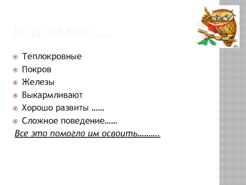 ПОДСКАЗКИ…….ТеплокровныеПокровЖелезыВыкармливаютХорошо развиты ……Сложное поведение……Все это помогло им освоить……….