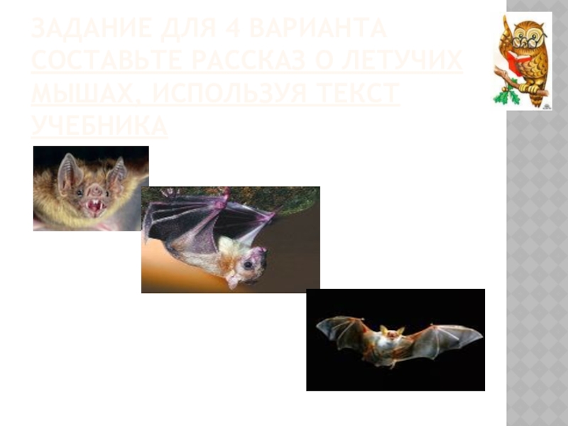 ЗАДАНИЕ ДЛЯ 4 ВАРИАНТА СОСТАВЬТЕ РАССКАЗ О ЛЕТУЧИХ МЫШАХ, ИСПОЛЬЗУЯ ТЕКСТ УЧЕБНИКА