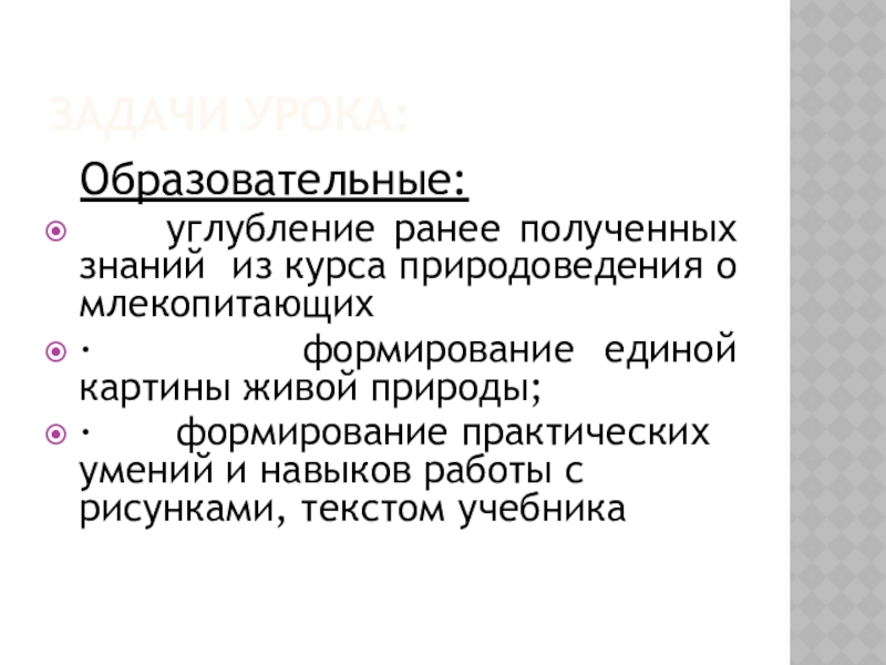ЗАДАЧИ УРОКА: Образовательные:   углубление ранее полученных знаний из курса природоведения о млекопитающих·