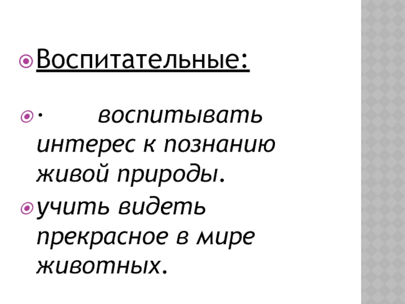 Воспитательные:·    воспитывать интерес к познанию живой природы.учить видеть прекрасное в мире животных.
