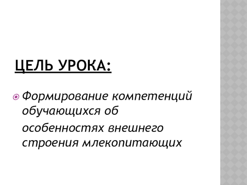 ЦЕЛЬ УРОКА:Формирование компетенций обучающихся об особенностях внешнего строения млекопитающих