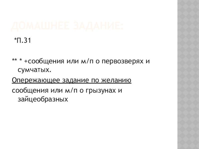 ДОМАШНЕЕ ЗАДАНИЕ: *П.31** * +сообщения или м/п о первозверях и сумчатых.Опережающее задание по желаниюсообщения или м/п о