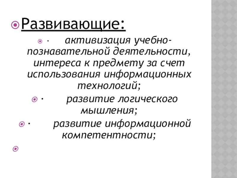 Развивающие:·   активизация учебно-познавательной деятельности, интереса к предмету за счет использования информационных технологий;·