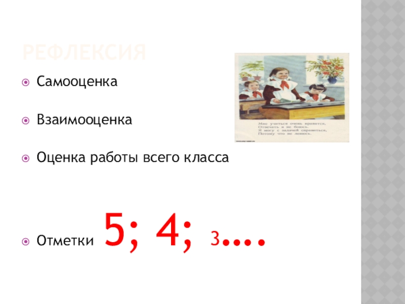 РЕФЛЕКСИЯСамооценкаВзаимооценкаОценка работы всего классаОтметки 5; 4; 3….