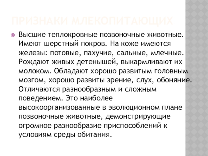 ПРИЗНАКИ МЛЕКОПИТАЮЩИХВысшие теплокровные позвоночные животные. Имеют шерстный покров. На коже имеются железы: потовые, пахучие, сальные, млечные. Рождают