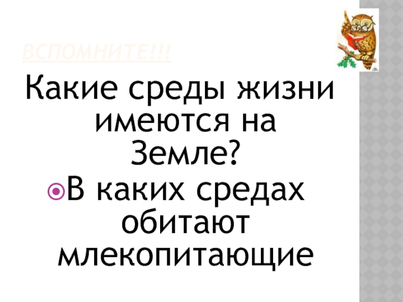 ВСПОМНИТЕ!!!Какие среды жизни имеются на Земле?В каких средах обитают млекопитающие