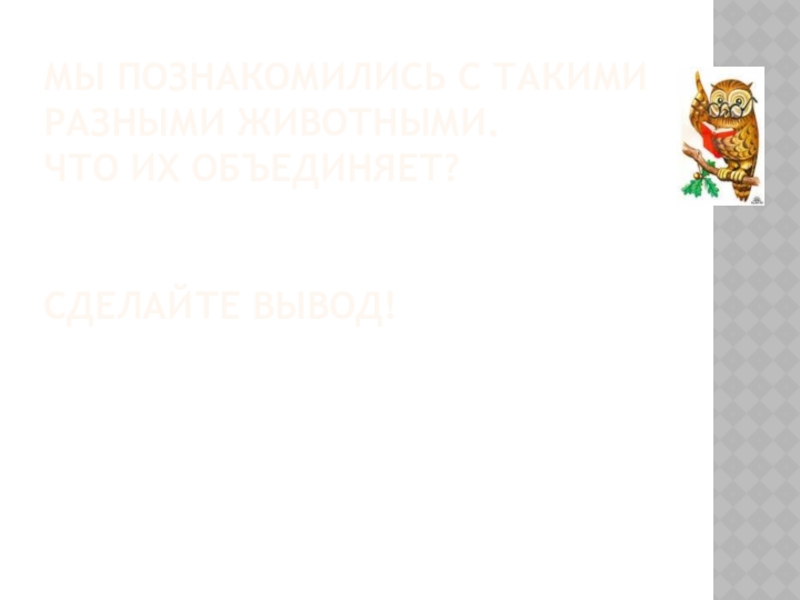 Слайд 15 МЫ ПОЗНАКОМИЛИСЬ С ТАКИМИ РАЗНЫМИ ЖИВОТНЫМИ. ЧТО ИХ ОБЪЕДИНЯЕТ? СДЕЛАЙТЕ ВЫВОД!
