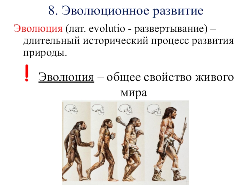 8. Эволюционное развитиеЭволюция (лат. evolutio - развертывание) – длительный исторический процесс развития природы.! Эволюция – общее свойство