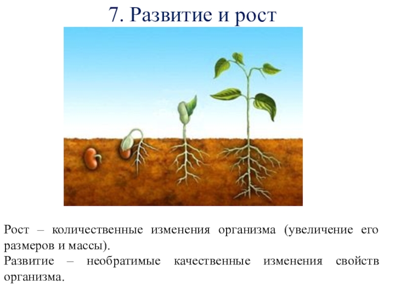 7. Развитие и ростРост – количественные изменения организма (увеличение его размеров и массы).Развитие – необратимые качественные изменения
