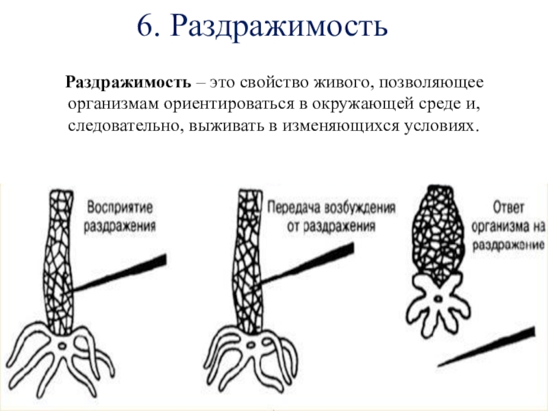 6. РаздражимостьРаздражимость – это свойство живого, позволяющее организмам ориентироваться в окружающей среде и, следовательно, выживать в изменяющихся