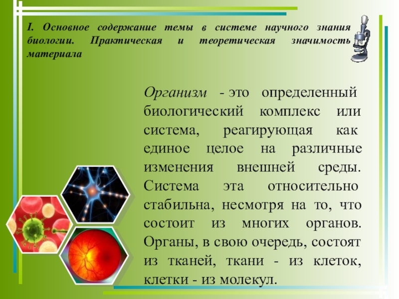 Организм - это определенный биологический комплекс или система, реагирующая как единое целое на различные изменения внешней среды. Система эта относительно стабильна, несмотря на то, что состоит из многих органов. Органы, в свою очередь, состоят из тканей, ткани - из клеток, клетки - из молекул.