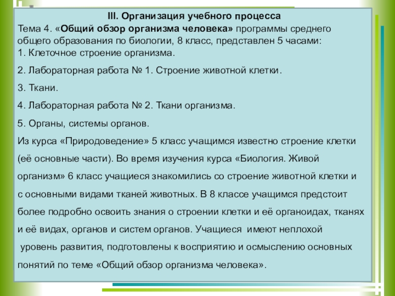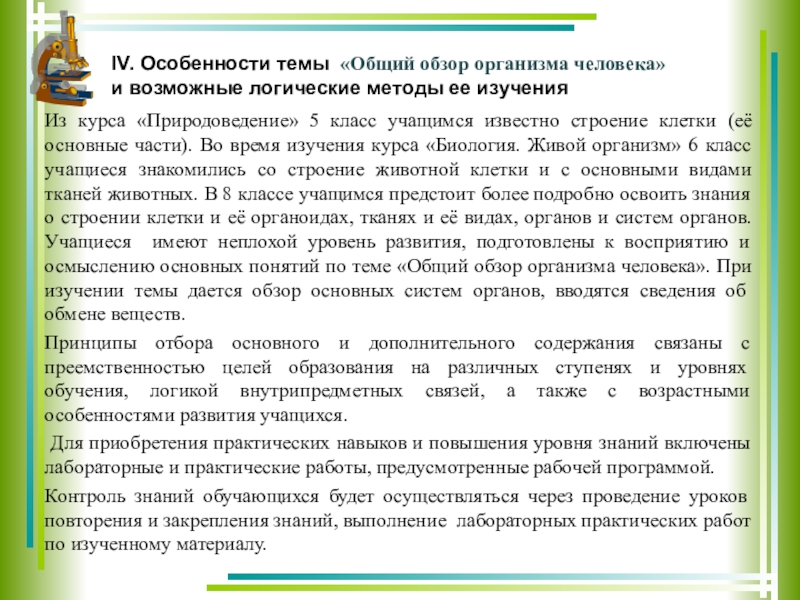 IV. Особенности темы «Общий обзор организма человека»