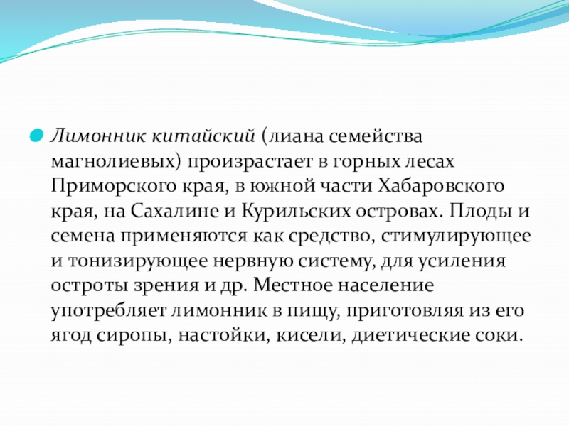 Слайд 23Лимонник китайский (лиана семейства магнолиевых) произрастает в горных лесах Приморского края, в