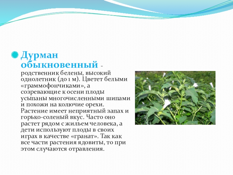 Слайд 12Дурман обыкновенный - родственник белены, высокий однолетник (до 1 м). Цветет