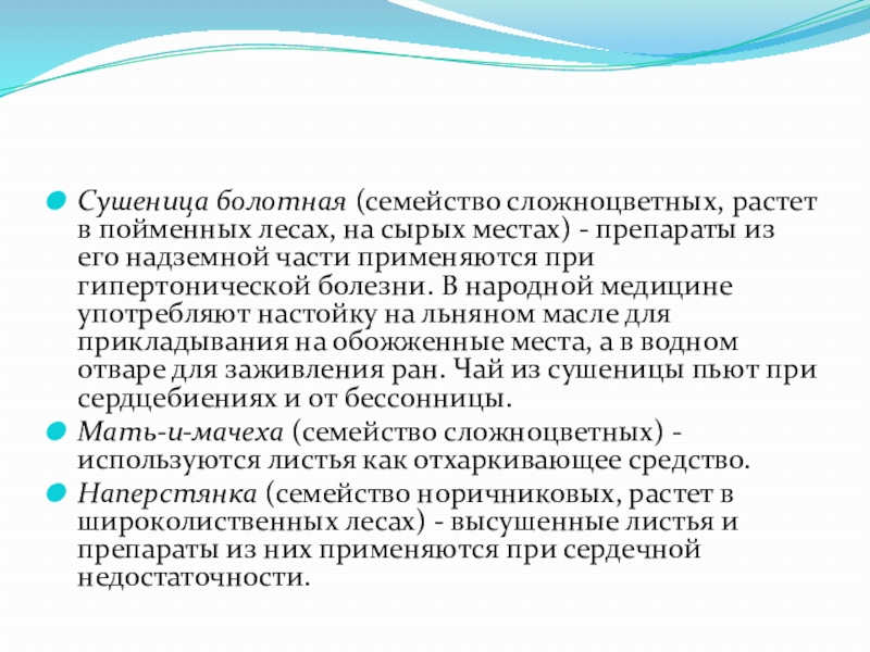 Слайд 20Сушеница болотная (семейство сложноцветных, растет в пойменных лесах, на сырых местах) -