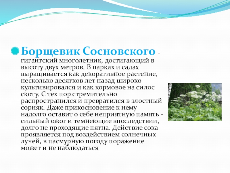 Слайд 14Борщевик Сосновского - гигантский многолетник, достигающий в высоту двух метров. В