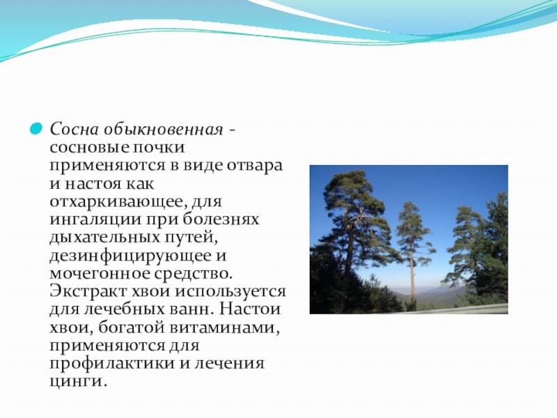 Слайд 18Сосна обыкновенная - сосновые почки применяются в виде отвара и настоя как