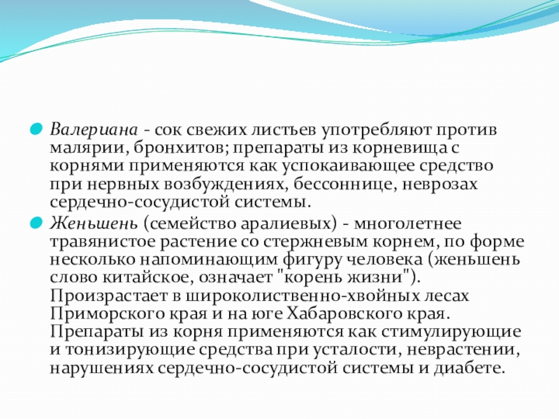 Слайд 22Валериана - сок свежих листьев употребляют против малярии, бронхитов; препараты из корневища