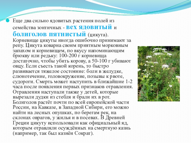 ядовитый и болиголов пятнистый (цикута). Корневище цикуты иногда ошибочно принимают за репу. Цикута коварна своим приятным морковным запахом и корневищем, по вкусу напоминающим брюкву или редьку: 100-200 г корневища достаточно, чтобы убить корову, а 50-100 г убивают овцу. Если съесть такой корень, то быстро развивается тяжелое состояние: боли в желудке, слюнотечение, головокружение, позывы к рвоте, судороги. Смерть может наступить в ближайшие 1-2 часа после появления первых признаков отравления. Отравления наступали также у детей, которые вырезали дудки из стебля и брали их в рот. Болиголов растёт почти по всей европейской части России, на Кавказе, в Западной Сибири, его можно найти на лесных опушках, по берегам рек, на склонах оврагов, у жилья и в посевах. В Древней Греции цикуту использовали как официальный яд, которым отравляли осуждённых на смертную казнь (например, так был казнён Сократ).