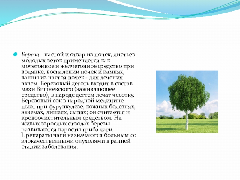 Слайд 17Береза - настой и отвар из почек, листьев молодых веток применяется как