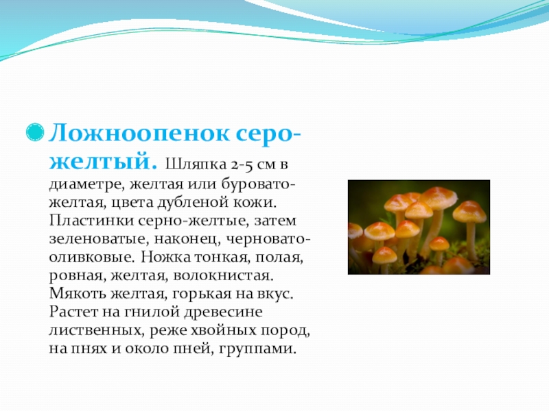 Слайд 5Ложноопенок серо-желтый. Шляпка 2-5 см в диаметре, желтая или буровато-желтая, цвета