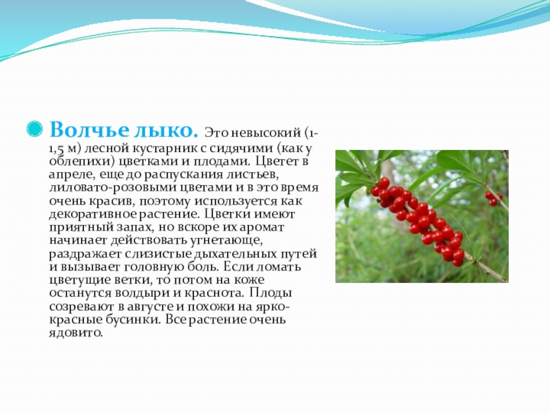 Слайд 9Волчье лыко. Это невысокий (1- 1,5 м) лесной кустарник с сидячими