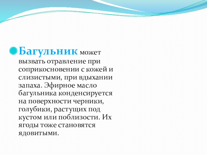 Слайд 13Багульник может вызвать отравление при соприкосновении с кожей и слизистыми, при