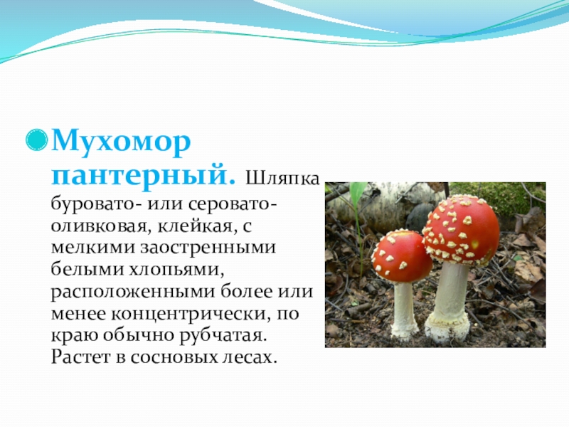 Слайд 6Мухомор пантерный. Шляпка буровато- или серовато-оливковая, клейкая, с мелкими заостренными белыми