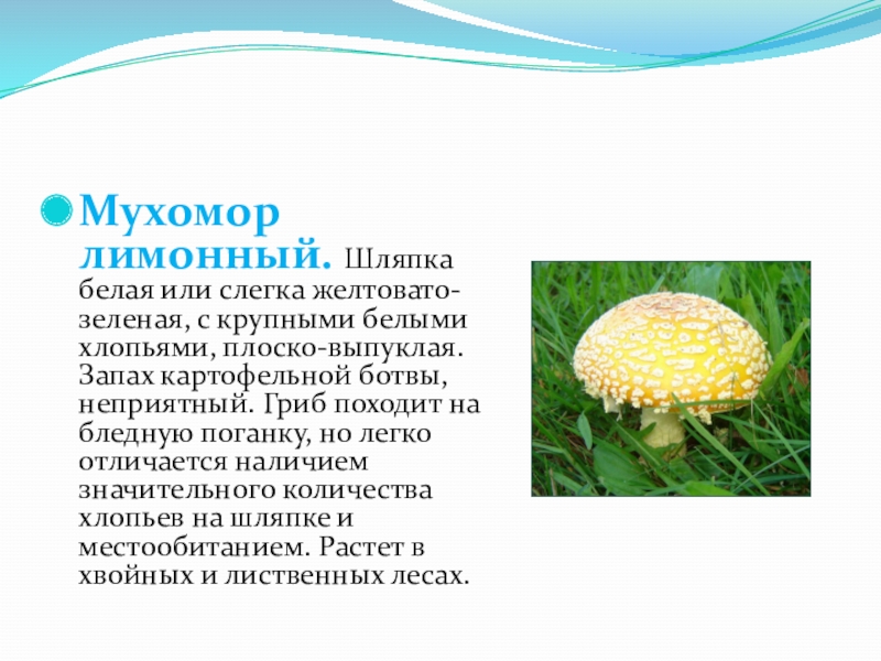 Слайд 7Мухомор лимонный. Шляпка белая или слегка желтовато-зеленая, с крупными белыми хлопьями,