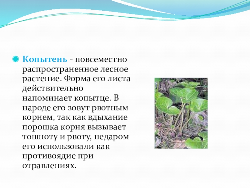 Слайд 10Копытень - повсеместно распространенное лесное растение. Форма его листа действительно напоминает