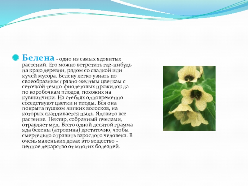 Слайд 11Белена - одно из самых ядовитых растений. Его можно встретить где-нибудь