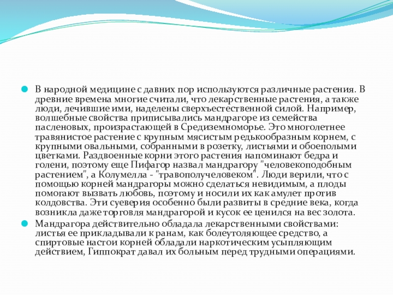 времена многие считали, что лекарственные растения, а также люди, лечившие ими, наделены сверхъестественной силой. Например, волшебные свойства приписывались мандрагоре из семейства пасленовых, произрастающей в Средиземноморье. Это многолетнее травянистое растение с крупным мясистым редькообразным корнем, с крупными овальными, собранными в розетку, листьями и обоеполыми цветками. Раздвоенные корни этого растения напоминают бедра и голени, поэтому еще Пифагор назвал мандрагору "человекоподобным растением", а Колумелла - "травополучеловеком". Люди верили, что с помощью корней мандрагоры можно сделаться невидимым, а плоды помогают вызвать любовь, поэтому и носили их как амулет против колдовства. Эти суеверия особенно были развиты в средние века, когда возникла даже торговля мандрагорой и кусок ее ценился на вес золота.
