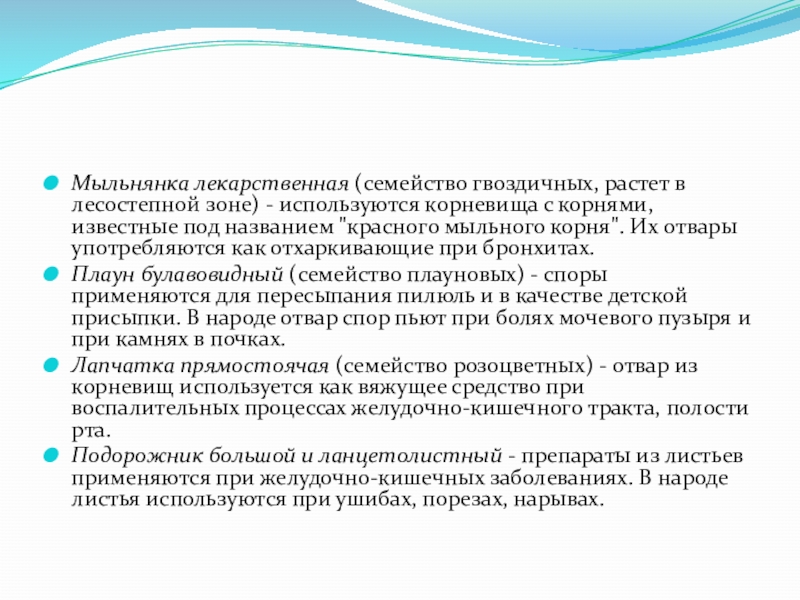 Слайд 21Мыльнянка лекарственная (семейство гвоздичных, растет в лесостепной зоне) - используются корневища с