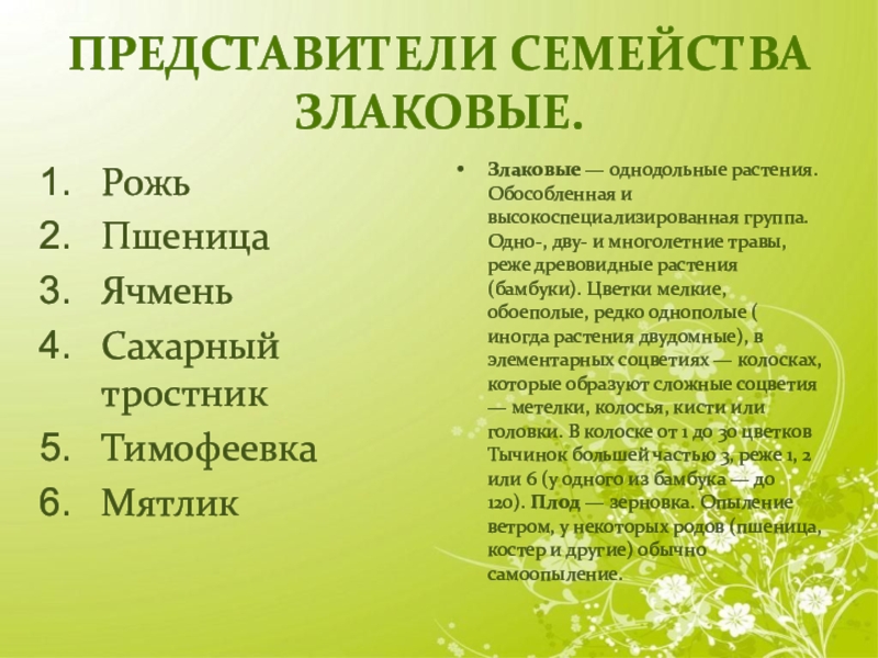 Представители семейства злаковые.РожьПшеницаЯчменьСахарный тростникТимофеевкаМятликЗлаковые — однодольные растения. Обособленная и высокоспециализированная группа. Одно-, дву- и многолетние травы, реже древовидные