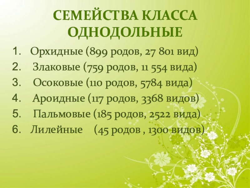 Семейства класса однодольныеОрхидные (899 родов, 27 801 вид) Злаковые (759 родов, 11 554 вида) Осоковые (110 родов, 5784 вида) Ароидные (117 родов,