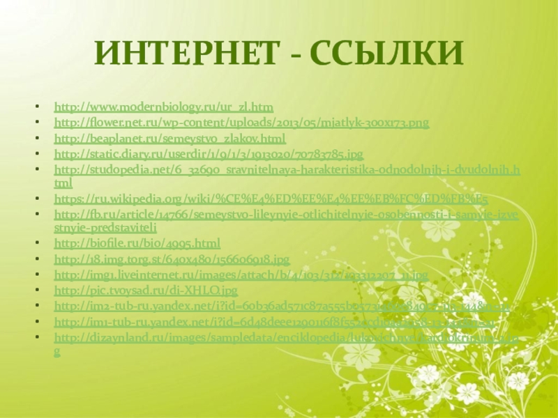 Интернет - Ссылкиhttp://www.modernbiology.ru/ur_zl.htmhttp://flower.net.ru/wp-content/uploads/2013/05/mjatlyk-300x173.pnghttp://beaplanet.ru/semeystvo_zlakov.htmlhttp://static.diary.ru/userdir/1/9/1/3/1913020/70783785.jpghttp://studopedia.net/6_32690_sravnitelnaya-harakteristika-odnodolnih-i-dvudolnih.htmlhttps://ru.wikipedia.org/wiki/%CE%E4%ED%EE%E4%EE%EB%FC%ED%FB%E5http://fb.ru/article/14766/semeystvo-lileynyie-otlichitelnyie-osobennosti-i-samyie-izvestnyie-predstavitelihttp://biofile.ru/bio/4995.htmlhttp://18.img.torg.st/640x480/156606918.jpghttp://img1.liveinternet.ru/images/attach/b/4/103/312/103312207_11.jpghttp://pic.tvoysad.ru/di-XHLO.jpghttp://im2-tub-ru.yandex.net/i?id=60b36ad571c87a555b05731460e849c7-113-144&n=21http://im1-tub-ru.yandex.net/i?id=6d48deee1290116f8f552ccd10aa2958-13-144&n=21http://dizaynland.ru/images/sampledata/enciklopedia/lukovichnye/kardiokrinum-2.jpg