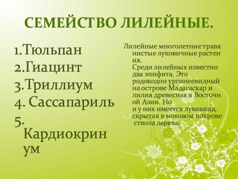 Семейство лилейные.1.Тюльпан2.Гиацинт3.Триллиум4. Сассапариль5. КардиокринумЛилейные многолетние травянистые луковичные растения.      Среди лилейных известно два эпифита. Это   родокодон ургинеевидный на острове Мадагаскар и   лилия древесная в Восточной Азии. Но и у них имеется луковица,  скрытая в моховом покрове ствола дерева.