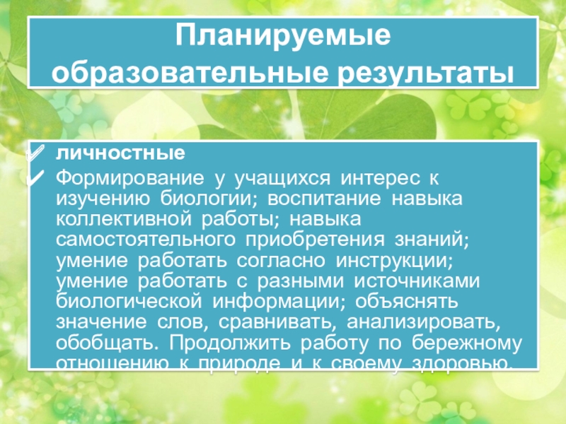 Планируемые образовательные результатыличностныеФормирование у учащихся интерес к изучению биологии; воспитание навыка коллективной работы; навыка самостоятельного приобретения знаний;