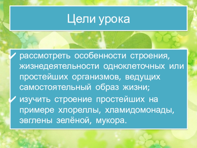 Цели урокарассмотреть особенности строения, жизнедеятельности одноклеточных или простейших организмов, ведущих самостоятельный образ жизни; изучить строение простейших на примере хлореллы, хламидомонады, эвглены зелёной, мукора.