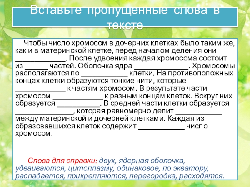 Вставьте пропущенные слова в тексте   Чтобы число хромосом в дочерних клетках было таким же, как