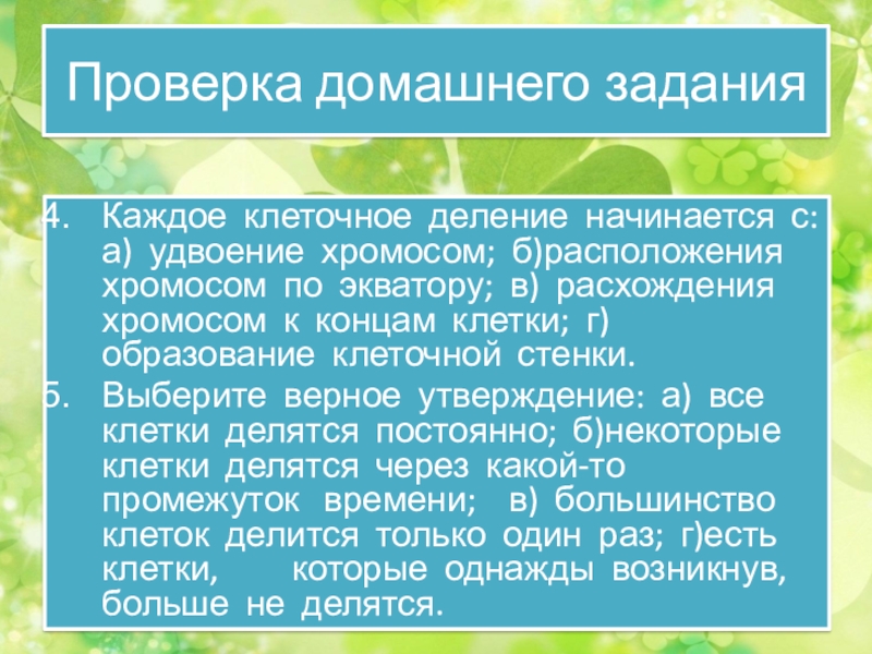 Проверка домашнего заданияКаждое клеточное деление начинается с: а) удвоение хромосом; б)расположения хромосом по экватору; в) расхождения хромосом