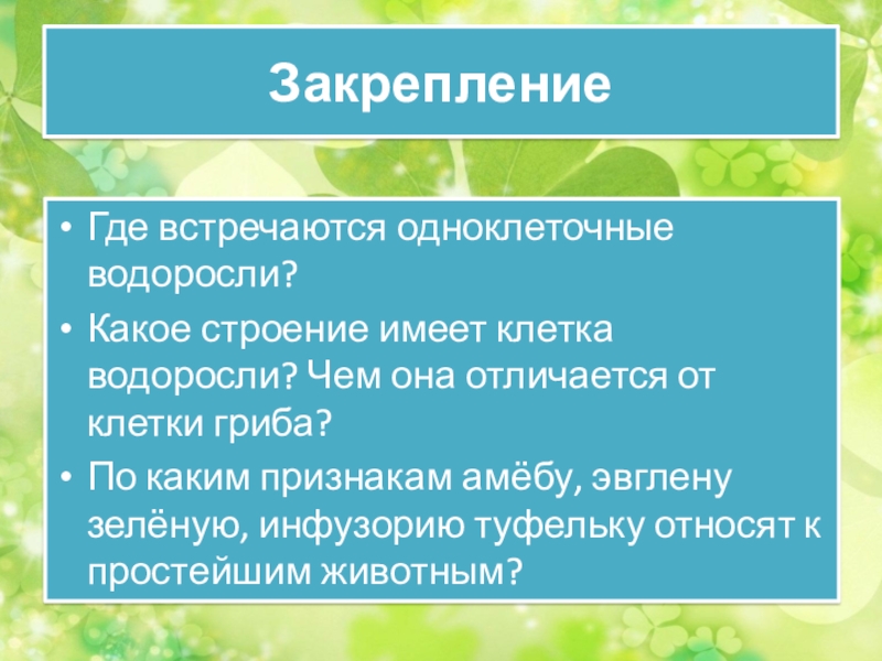 Закрепление Где встречаются одноклеточные водоросли?Какое строение имеет клетка водоросли? Чем она отличается от клетки гриба?По каким признакам