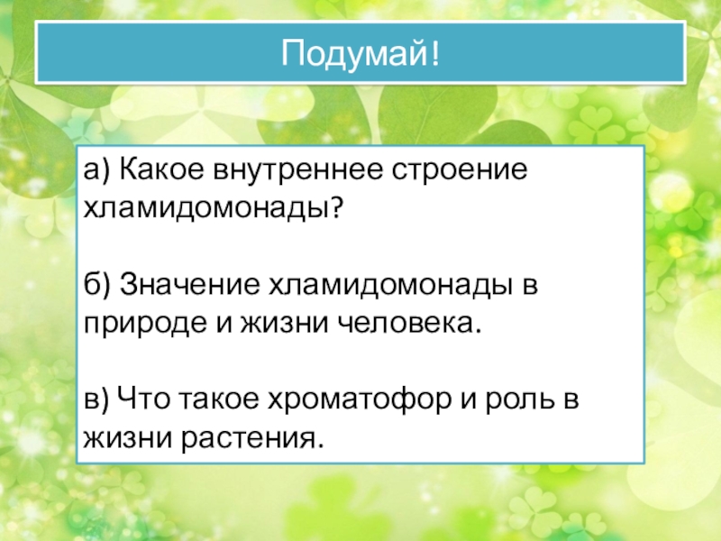 Подумай!а) Какое внутреннее строение хламидомонады?б) Значение хламидомонады в природе и жизни человека.в) Что такое хроматофор и роль