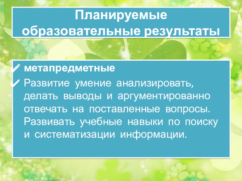 Планируемые образовательные результатыметапредметныеРазвитие умение анализировать, делать выводы и аргументированно отвечать на поставленные вопросы. Развивать учебные навыки по