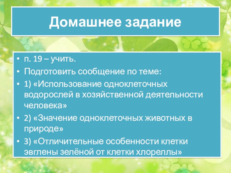 Домашнее заданиеп. 19 – учить.Подготовить сообщение по теме:1) «Использование одноклеточных водорослей в хозяйственной деятельности человека»2) «Значение одноклеточных