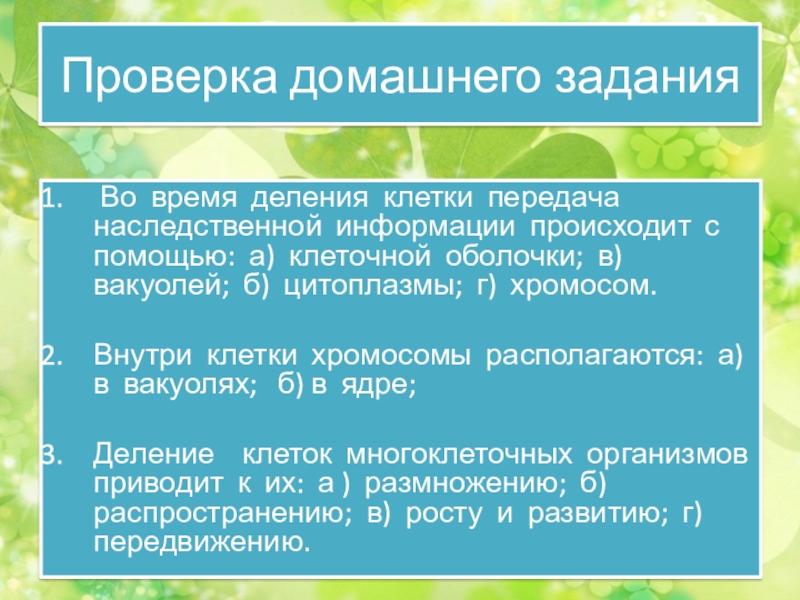 Проверка домашнего задания Во время деления клетки передача наследственной информации происходит с помощью: а) клеточной оболочки; в)