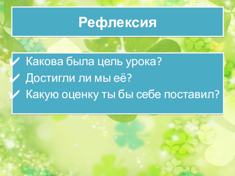 Рефлексия Какова была цель урока? Достигли ли мы её? Какую оценку ты бы себе поставил?